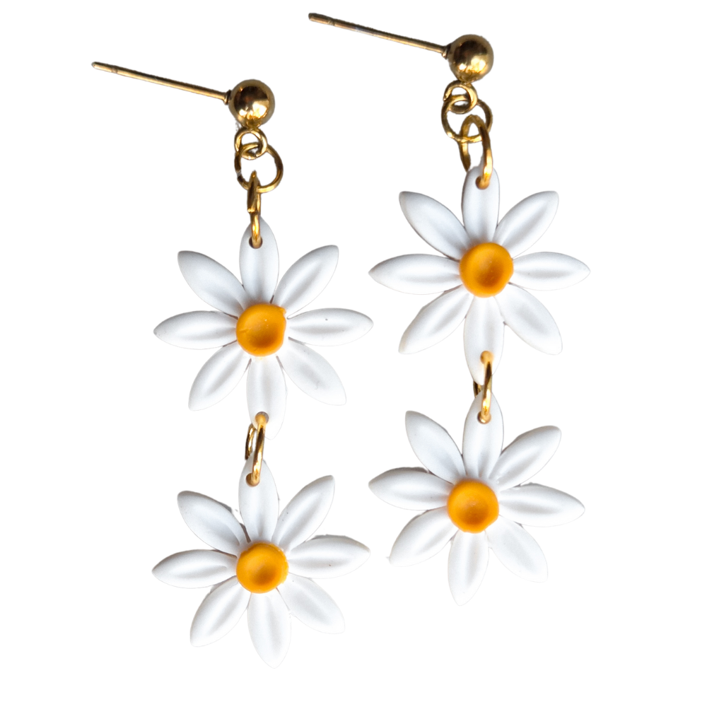 Twee madeliefjes onder elkaar, aan een goud- of zilverkleurig hangertje. Past bij elke outfit en zorgt voor instant vrolijkheid! Bekijk ook de madelief-studs of de grote madelief oorbel.