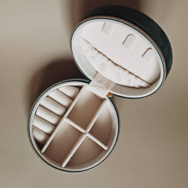 Compact rond sieradendoosje in een mooie petrol kleur.