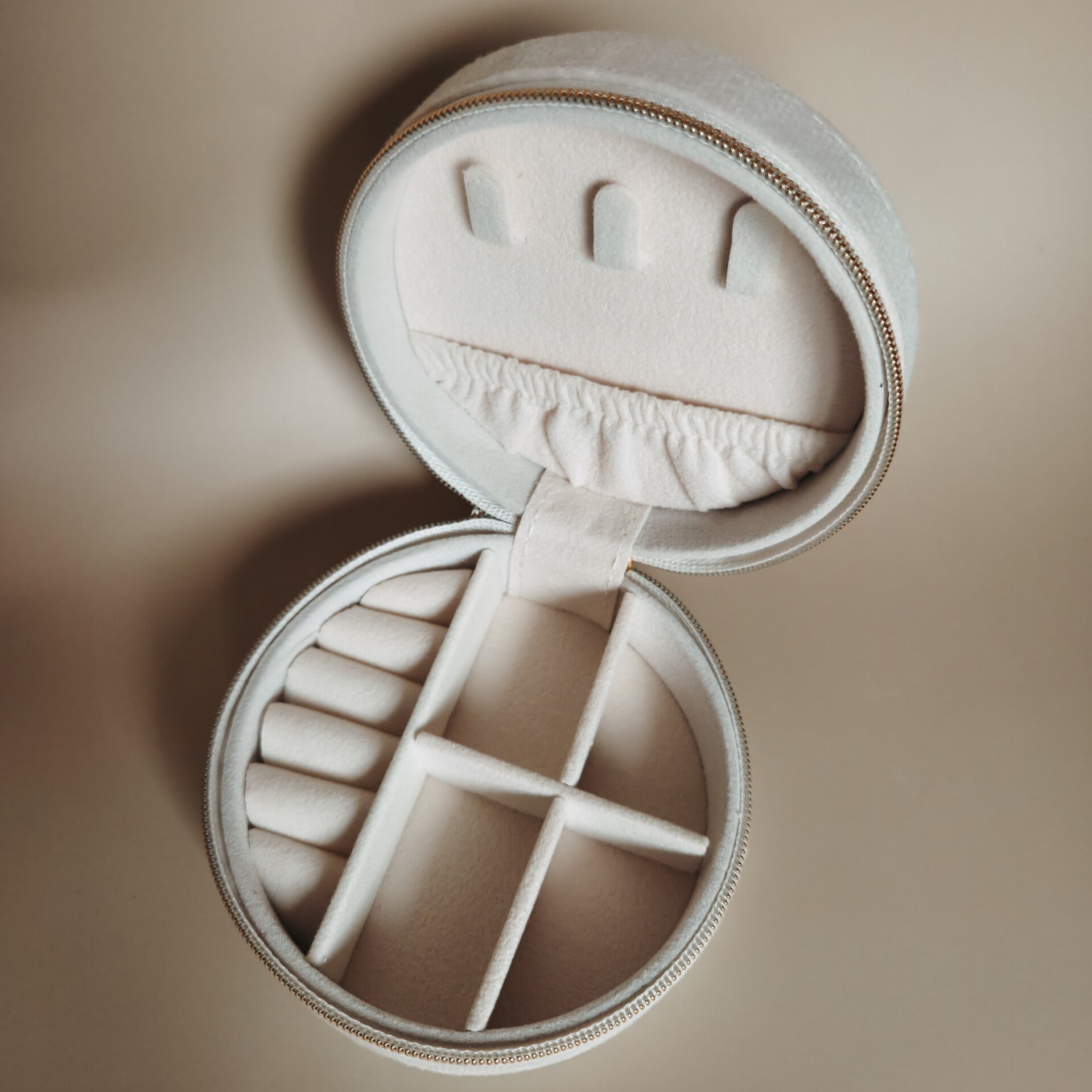 Met een formaat van 10cm is dit doosje perfect om mee te nemen. Binnenin vind je plek voor meerdere paren oorbellen, knopjes, ringen, armbanden en kettingen. De stevige rits houdt alles netjes en veilig op z’n plek.