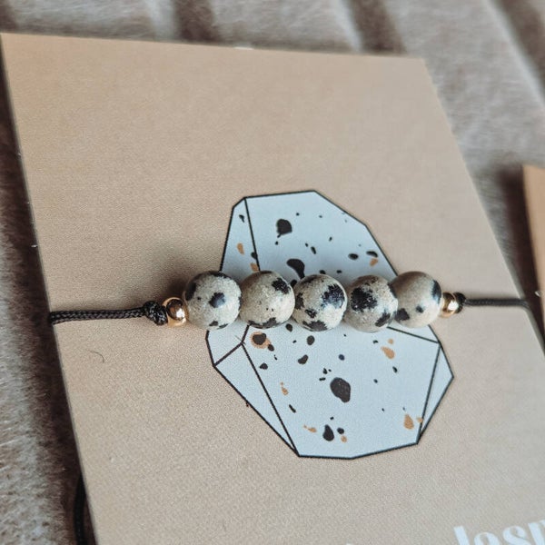 Dit edelsteen armbandje met dalmatier jaspis staat voor bescherming, actie en balans en boost je energie en moedigt je aan tot actie.