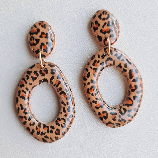 Deze oorbellen met panterprint zijn echte eyecathers. De oorbellen zijn met de hand gemaakt en afgewerkt met een laagje resin, wat ze een prachtige glans geeft. Verkrijgbaar met zilver- of goudkleurig ringetje.